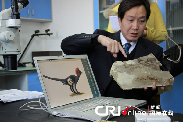 一个约A4纸大小的化石在专家的描述中仿佛有了生命,李全国指着黄褐色的标本滔滔不绝:“上面的恐龙是赫氏近鸟龙,被认为是与鸟类关系比较接近的恐龙,长有4个翅膀,大小像孔雀。看,这只生活在距今1.55亿年前的恐龙多漂亮,嘴巴像啄木鸟,脸部是有斑点的,头部羽冠是红褐色的,四翼条纹状的羽毛黑白相间,羽间是黑色的……”