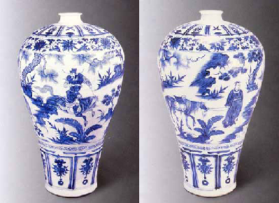 现藏于江苏省南京市博物馆的“萧何月下追韩信”梅瓶,出土于江宁县牛首山的洪武二十五年(1392年)沐英墓中。画面在梅瓶的腹部,占据主要位置。上下饰西蕃莲、杂宝、变形莲瓣纹、垂珠纹等。画面主题鲜明突出,讲述了“萧何月下追韩信”的典故,主要人物萧何头戴展脚幞头,着袍束带,五络须髯,左手控缰,右手挥鞭,策马飞奔。画面的另一侧,韩信头裹软巾,身着长袍,手牵战马在溪边饮水。空白处衬以苍松、梅竹、山石,错落有致。