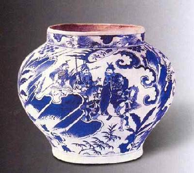 元代青花人物瓷器的出现,是在宋元文学的通俗普及,特别是在杂剧的广泛传播的前提之下产生的。当时瓷器只是其中的载体之一。更早一些的金朝,就在砖雕上表现戏剧人物,山西侯马、稷山金墓中屡屡见到,其中就有“单骑救主”故事。到了元代,铜镜背纹有“柳毅传书”、“洛神”图;螺钿器有“三顾茅庐”长方案、“高力士脱靴”盒、“瑶池仙庆”盒等;江苏吴县出土过“姜太公垂钓金带扣”。但是,在这些器物上,无论人物刻画、动作表情,还是山石皴擦,都比不上青花瓷器所画的酣畅、流利。