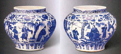 品类纷繁的元代瓷器中,青花瓷器以鲜活、艳丽、明快独树一帜。青花瓷器中,又以人物故事为装饰题材的最具特点。元代是杂剧兴盛的时代,关汉卿、王实甫、白朴、马致远等创作了《窦娥冤》、《西厢记》、《汉宫秋》等一批可传之百代的作品。同时这也是杂剧普及的时代,流行于市井茶肆,植根于平民百姓之中,这一点从元代人物故事瓷器上得到了证明。它的数量虽少,但绘画技法高超,特别是画面小中见大,且多表现元代杂剧的故事场景,开创了全新的视觉领域。