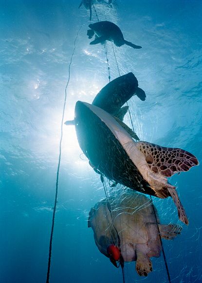 本图中,一只绿海龟被困于巴西沿岸的刺网之中。华莱士认为,与多钩长线或拖网相比,被困于刺网中的海龟死亡率更高。多钩长线是一种漂浮于海洋表面的渔线,可以延伸数英里长,上面带有数千个铒钩。拖网则是一种用于海底捕鱼、大口袋形状的渔网。