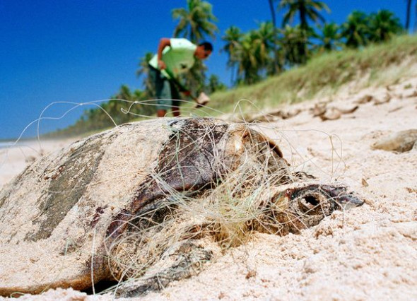 许多淹死于渔网中的海龟被抛弃于海岸之上。本图中的这只死海龟发现于巴西海岸。据华莱士介绍,特别是一些小型捕鱼者,他们的捕鱼船上根本没有盛放海龟的空间。华莱士说,“你可以想象到,如果你是一名小型捕鱼者,你的刺网就是你的‘餐券’。如果你的刺网上困住了一只大革龟,如果你再试图释放它,那你将要冒着生命的危险。”