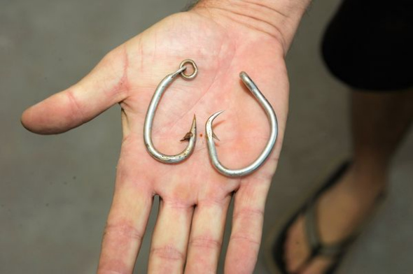 多钩长线上通常使用两种渔钩,一种是J型钩(左),一种是圆形钩(右)。J型钩很容易被猎物吞下,可能会对海龟造成更大的伤害。因此,许多渔民现在换成了圆形钩。例如,在夏威夷登记的所有多钩长线现在都被要求使用圆形钩。夏威夷渔业协会还对多钩长线上被困海龟数量有一个上限要求,渔船上的观察员要及时跟踪被困的海龟数量。华莱士介绍说,尽管受到了政府的管制,但是夏威夷的渔业生产仍然很稳定、多产。