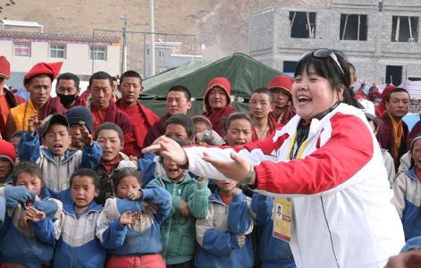 心理学家说,如果能在灾后21天内迅速加强心理辅导、化解伤害、积极引导关怀的话,孩子们不但能够快速走出震难带来的心里苦痛,而且在潜意识里不容易留下负面情结。”18日,尽管志愿者的高原反应依然没有褪去,但是一想到第三完小的三千多名孩子,面对如此沉重的伤害,仍然没有可以遮风挡雨的教室,志愿者们心急如焚。看望孩子们的时候,志愿者在操场上教孩子们唱起了手语歌,“我愿意把爱全部给你……”这歌声回荡在灾区的漫漫黄沙中,越来越多的孩子被歌声吸引到学校的操场,从一开始的几位同学到几百个孩子在操场上高唱,“中华民族,经得起考验,只要黄河长江的水不断……”孩子们坚定的眼神中,勇气渐渐多于悲伤。家长和老师的脸上也渐渐有了久违的笑容。志愿者们帮助学校搭起了帐篷学堂,600多位孩子于19日复课。孩子们很快将搬进仁爱捐建的3500平米板房教室。截止目前,志愿者们一直在带动孩子们唱歌、游戏,希望他们可以快速释放悲伤,此后,将开展一对一的心理辅导。