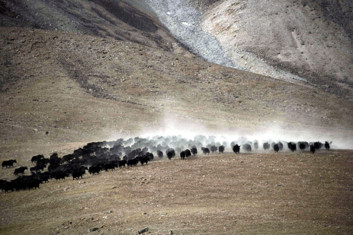 野牦牛通常结群活动,但是即便在可可西里,300余只的野牦牛群也并非轻易能见。当我们深入可可西里考察时,刚刚离开青藏公路不远,就迎来这样的奇遇。理论上讲,只有因年老或疾病的独牛才爱主动发起攻击,即使越野车也能被它顶翻;但野牦牛群反而不具备很强的侵略性。可是,当真正面对着这群如坦克方阵般奔腾咆哮的野牦牛时,并非任何人都有胆量冒着粉身碎骨的危险冲至距离牛群150米处拍摄下这样的大场面。万幸,照片拍完时,躁动起来的牛群并没有冲我们奔蹋而来,而是扭头向山谷后退去。摄影/单之蔷