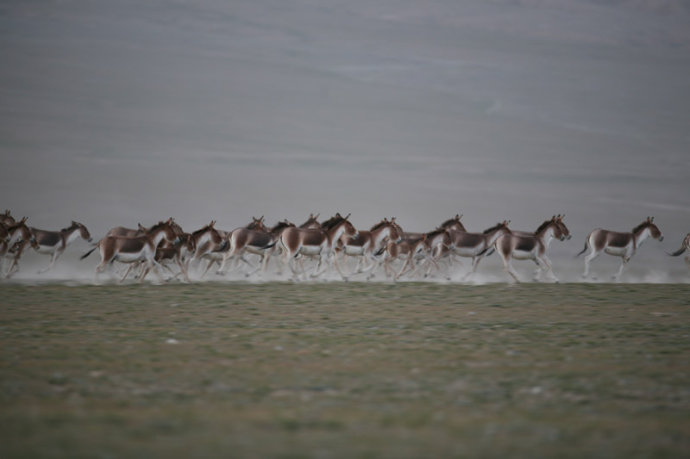 奔腾的藏野驴是青藏高原上常见的壮丽场景。时处8月,这群藏野驴刚刚换上漂亮的新毛,即便在海拔超过5000米的高原上,它们奔跑的时速也仍可达到60公里。摄影/刘五洲