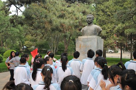此前三个小时,志愿者们带领同学们游览了北大校园,从博雅塔、未名湖,到蔡元培先生的雕像前,从北大图书馆、百年讲堂,再到北大静园的草坪上……考虑到同学们是第一次来到北大校园,志愿者们经过精心筹划,将同学们分成四个游览组,并为每组配备了导游、安全员、联络员和摄影师,让同学们在游览中充分感受北大的人文特色、建筑风格及其精神魅力。