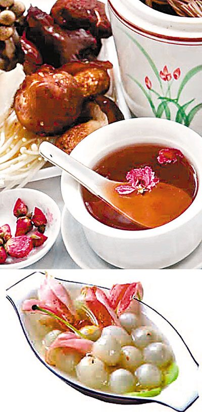 清朝慈禧为美颜养身,常以鲜花为食。每年六月之后,在荷花盛开的季节,待红日跃出地平线,荷花开放后,慈禧令宫女们采摘最完整、妖艳的荷花带回御膳房,将肥壮的花瓣浸在鸡蛋、鸡汤调好的淀粉糊里,再炸至金黄酥脆作为点心。她还将玫瑰花捣烂,拌以红糖,经过特殊的配料加工,制成一种花酱,涂在面食点心上,食后齿颊留香。由于慈禧太后常用鲜花提取精萃,用于美容、美发、润肤,她的肤发老而不衰。
