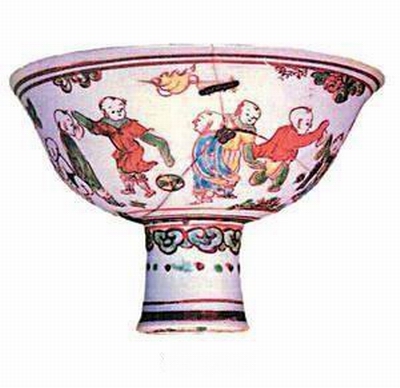 据收藏此瓷片的宣先生介绍,此瓷片是他早年在德清县城一处工地上捡回来的。根据形状分析,有可能是明代瓷碗残片。因为明代瓷器上多有画、文记载儿童蹴鞠图。明宣德青花瓷上常画有三人场的儿童蹴鞠图。正德青花瓷碗及明末的青花瓷碗上则画二人场的儿童蹴鞠图。此类图案,动作活泼异常,栩栩如生。