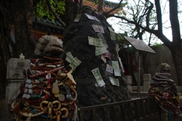 大金瓦寺前的白旃檀树更是众人所朝拜的圣物,塔尔寺藏语称“衮本贤巴林”, 意为十万佛像弥勒洲,据说这棵树是在大师出生的脐带血上生长出来的,而每一片叶子上都可以看到一幅狮子吼佛像,塔尔寺因此得名。在龙泉讲堂王尧教授的讲座中,也曾讲过这个典故,但是他说并不是每个人都能够看到,可能还是要看个人的信心吧。现在白旃檀树刚刚抽出新枝,叶子如指头大小,点点翠绿孕育无限的希望。
