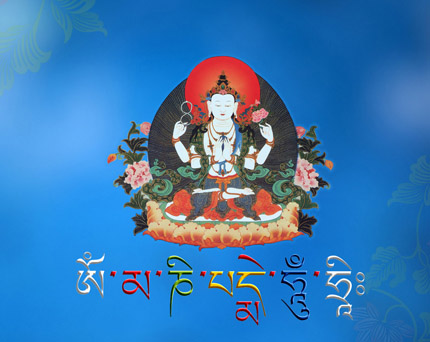 同样地,观世音菩萨的六字大明咒——唵玛呢呗美吽,是诸佛慈悲智慧的音声显现,其中涵摄了佛所教授八万四千法门的精义。在众多不同的咒语中,如明咒、陀罗尼咒、密咒,没有一个比观世音菩萨的六字大明咒更殊胜。持诵这个一般所称为玛呢咒的大利益,在佛经和密续中一再被提及。据说,只持诵玛呢咒一遍,就等于诵念了佛陀所传的十二分教。持诵六字大明咒即圆满了菩萨的六度,并能稳固地杜绝任何投生六道的可能性。这是个简单的修法,容易了解,所有人都能修持,也包含了佛法的要义。如果你把玛呢咒当作快乐与痛苦时的唯一皈依处,那么观世音菩萨将一直与你同在,而你将不假造作地愈来愈虔诚,自然升起对大乘之道的所有了悟。
