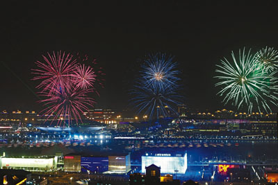 声、光、电、江面、烟火、喷泉、再加上巨大的LED幕,上海世博会开幕式最激动人心的表演在黄浦江两岸,从卢浦大桥到南浦大桥3.28公里的延长线上展开。据透露,这是上海历史上规模最大的一次焰火表演,300多个品种、10万余发烟花,全方位覆盖江面、陆地和天空。