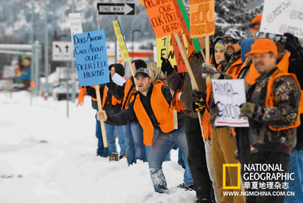 在位于卡利斯佩尔的蒙大拿州鱼类、野生动物与公园管理局门外,猎人们群起抗议有关保护狼群的联邦法规。当地的锯木场、工厂接连倒闭,经济衰退,而捕杀野味的狼群使得人们冰箱里的冬储肉食愈发少了(左侧标语牌,“还有没有人管我们的鹿群”)。