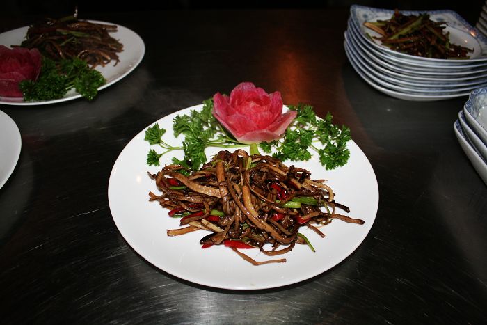 做法:香菇剪成丝、腌制、挂糊、炸脆,用素耗油汁、糖等调料炒制,装盘码成山形。
