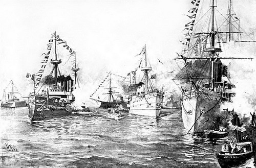 展区中心水面上停靠着三艘形貌古老的帆船,给芝加哥世博会画上了点睛之笔。西班牙政府根据历史典籍的记载和描绘,按照原来尺寸复制了哥伦布1492年万里远航时乘坐的旗舰圣·玛利亚号及另外两艘帆船尼尼亚号与平塔号。1892年8月6日,这三条仿古船按照哥伦布400年前出发的时辰和地点,从西班牙帕洛斯城扬帆启航开赴美国。1893年4月27日,十多个国家35艘军舰在纽约港首次举行国际海上阅兵式,庆祝芝加哥世博会开幕。圣·玛利亚号和尼尼亚号、平塔号也加入了“联合舰队”,成为哈德逊河上最灿烂的明星。此后沿圣·劳伦斯河驶进芝加哥密歇根湖,这是西班牙赠送给芝加哥世博会最珍贵的礼物。