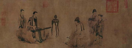《伯牙鼓琴图卷》,元王振鹏作,表现了俞伯牙与钟子期以琴会友的场景。