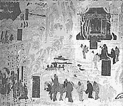 初唐第323窟敦煌壁画。孙权建造建初寺并阿育王塔,供奉康僧会请得的舍利,这段历史被敦煌壁画记载了下来。