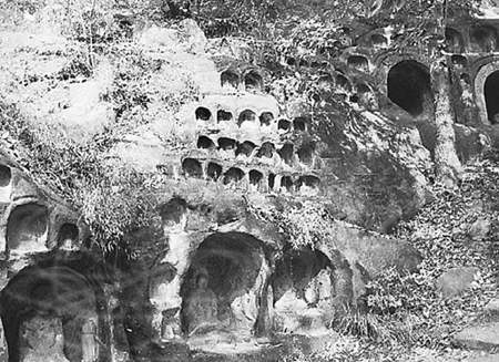 南京栖霞寺千佛岩石窟造像是我国南方开凿最早、规模最宏伟的佛窟群,始于南齐永明二年(484),几乎与北方的云冈石窟同时代。最早开凿的无量殿中无量寿佛像坐身高三丈一尺五寸,总高四丈,观音、势至两菩萨像分侍左右,各高三丈三尺。此窟及窟中佛像为千佛岩之最。自无量殿东去,岭上岭下,依岩之高下就壁凿龛,状若蜂房,龛中造像,神态各异,大有丈余、小不盈尺。全山先后开凿了二百九十四个佛龛,造佛菩萨像共五百五十尊,号称千佛岩。