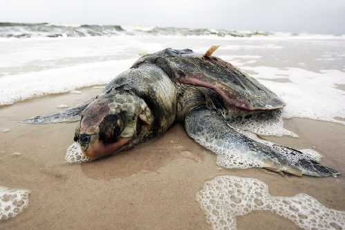 5月2日,美国总统奥巴马前往墨西哥湾视察漏油情况。他警告,漏油事故“可能导致前所未有的环境灾难”,救灾工作可能持续较长时间。奥巴马说,事故责任方、租用石油钻井平台的英国石油公司应承担责任,“为救灾花销埋单”。图为当地时间5月2日,美国帕司克里斯全海滩上一只死去的海龟。