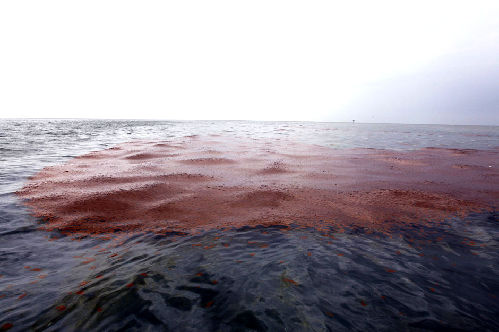 图为当地时间5月3日,美国Chandeleur Sound,被污染的海面。