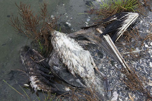 当地时间5月3日,美国Chandeleur Island,一只被污染后死去的鹈鹕。