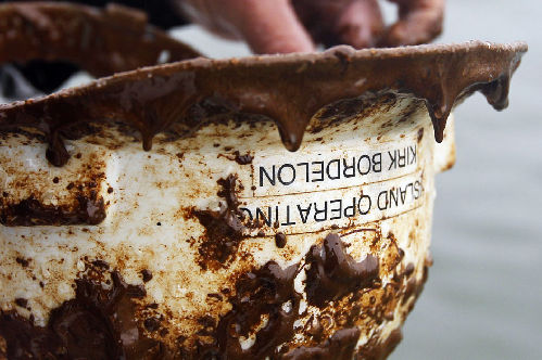 当地时间5月3日,美国Chandeleur Sound,一顶沾满泄露石油的头盔。