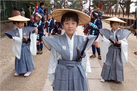 在春日神社内,日本儿童身着传统武士的服装。