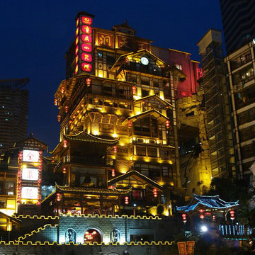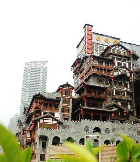 走进新近落成耸立在重庆市嘉陵江畔的吊脚楼建筑群——洪崖洞,其巴渝古老民俗文化的气息扑面而来。远远望去,洪崖洞犹如一尊高耸入云的巨形宝塔,高75米,下宽上窄,逐层收缩,建筑面积达6万平方米,是目前全国最大的吊脚楼建筑。它以重庆明清时代的吊脚楼为原型,依山就势,通过分层筑台、退台以及吊脚楼架空的形式,营造出一座具有浓厚巴渝民居特色的建筑群。