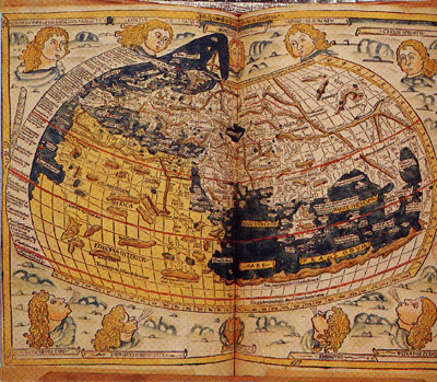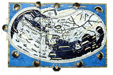 托勒密(Ptolemy公元87-150年)编写了8部《地理学指南》,所附27幅地图,是世界最早的地图集。他创造普通圆锥投影和球面投影两种世界地图的新投影方法,所绘的地图具有划时代的意义,且一直使用到16世纪。上图是1486年的复制本。