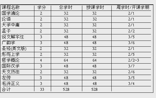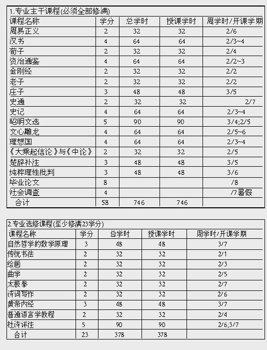 程水金:对,他一看就清楚。说实在话,我希望把155个学分都按我的设想安排为经史子集的元典精读课。可那不行啊!没办法,只好胀出一点。还有,经史子集、包括梵佛类、西学类的典籍我都是要一视同仁地开设的,没有什么“主干课”、“必修课”、“选修课”之类的区别,都是主要课程。但无奈的是,你必须要套进他这个课程类型的模块里面去。