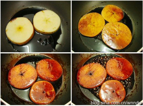 2、放入切片了的苹果,依然用小火,慢慢的两面“煎”;