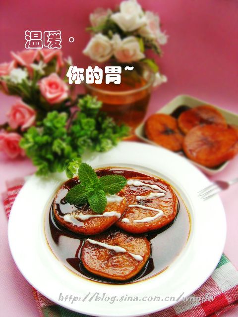 3、直煎到两面色泽很深,苹果略微脱水的样子,至少要5分钟以上,就可盛起苹果,淋少许酸奶点缀装盘食用。