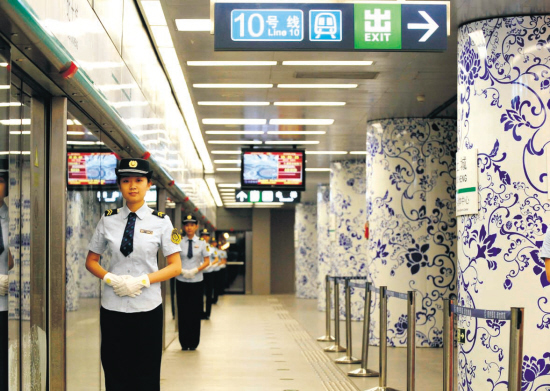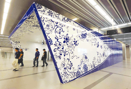 在地铁奥运支线北土城站地下一层, 28根高大的圆柱分列两旁,印着传统的青花瓷花纹图案,蓝花白底儿,满花、半花交叉错落,竖立有致,人在其间,犹如置身中国古典艺术展览馆。这些青花瓷图案是印在搪瓷钢板上,用800多度高温烧出,保证100年色彩不变。北土城站设计出自中央美院一群二三十岁的年轻设计师之手,他们的灵感来自于艺术与空间相结合,又同周边的古城墙遗址相协调。