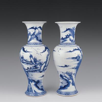 如康熙青花的色调鲜蓝青翠,明艳净丽,娇翠欲滴。画法精细挺秀,分色层次增加,甚至在一笔中分出深浅浓淡的笔韵,表达出纯熟的绘瓷技巧和丰富的表现力。如故宫博物院藏瓷青花锦鸡牡丹凤尾尊和青花人物山水纹盖罐,都是康熙时的典型作品。在装饰风格上,更多地吸取了民间木刻版画的表现手法,对所表现的形象做概括、夸张的加工,用刚劲、细致的笔法勾线,再以多种深浅料色渲染,看上去爽朗明快。康熙的青花成就使它一直都有深远的影响,它的料色成为后来模仿的标准。据了解,明末清初民间画风日盛,先后出了四王等颇具代表性的人物画家,康熙青花瓷器显然是沿用四王的画风,不仅线条流畅如行云流水般飘逸,且色阶丰富多变,画面层次感很强,比其他年代的青花瓷看起来更要有韵味,因此,康熙青花瓷可谓是清代瓷器中的极致精品。