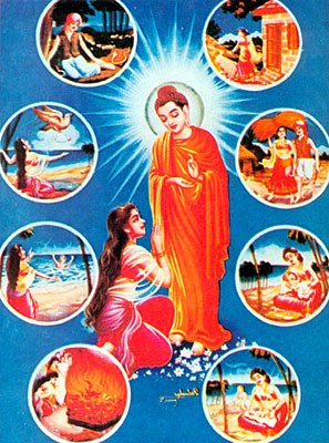 佛经上说,释迦牟尼成佛之时,大地震动诸天神人齐赞,地狱饿鬼畜生三道的许多苦厄,一时体息,天鼓齐鸣,发出妙音,天雨曼陀罗花,曼殊沙花,金花、银花、琉璃花、宝花、七宝莲花等。