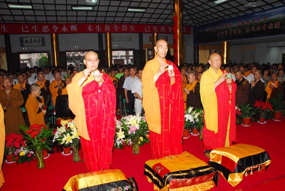 主法法师:监院智超法师(中)监院、佛学院常务副院长贤空法师(左)副寺来正法师