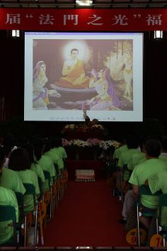 法师在正式介绍佛陀之前,先播放一段唱诵,是佛陀当年给弟子宣讲的《吉祥经》。
