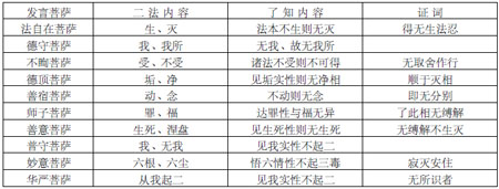 (一)先观一法之相空、性空,来否定此法。因无此法即无彼法,故亦否定另一法,而造成双遣法,证入不二法门。总共有十位菩萨,依此方法: