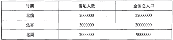 随着统治者宠爱和保护的升级,佛门享有的特权也日趋膨胀,寺庙经常得到大量的赏赐和捐赠,并且享有免除徭役和捐税的特权。《广弘明集》卷27载说:凡僧尼“寸绢不输官府,升米不进公仓”“家休大小之调,门停强弱之丁,人出随心,往来自在”。于是人们纷纷“竭财以赴僧,破产以趋佛”,(《梁书》卷48之范缜《神灭论》)以求得寺院的庇护。《通典》卷7有一个记载很典型,说:“天宝末年安禄山反,天下荒乱,赋役繁重,民不堪命。于是相率投入寺院,以求规避。杜佑为述其详情说:自兵兴以后,经费不完,于是征敛多名,且无恒数,贪吏横恣,因缘为奸,法令莫得检制,蒸庶不知告诉。其丁狡猾者即多规避。或假名入什,或托迹为僧,......万端蠲除,钝劣者即被征输,困竭日甚?这说明社会动荡以及苛捐杂税乃是促使一般平民投身佛门的主要原因。佛门为他们撑起了一把牢固的保护伞,以至于出现“富户强丁多削发以避徭役,所在充满”(《资治通鉴》卷211之《唐记·玄宗开元二年》)的局面。《广弘明集》卷6也记载:“逃役之流,仆隶之类,相与人道。”唐武宗会昌二年到五年(842—845年)曾发起一场大规模的灭佛运动,据统计:总共拆毁寺庙约4600所,僧尼还俗达26万多人,解放奴婢约15万人,可见当时佛门之兴旺。魏晋南北朝时期,投身佛门的热浪达到高潮,竟然“民多绝户而为沙门”。(《魏书》卷53之《李孝伯传附李埸传》)《魏书·释老志》记载说:“正光以后,天下多虞,王役尤甚,于是所在编民,相与人道,假摹沙门,实避调役,猥滥之极,自中国之有佛法,未之有也。略而计之,僧尼大众二百万矣。”根据《文献通考·户口考》及《北周书·武帝纪》记载,南北朝时期我国僧尼人数达到历史最高,列表如下: