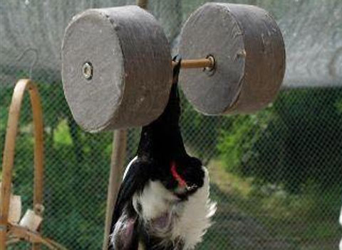 6月19日,退休职工伦纪书在训练喜鹊开“赛车”。今年70岁的伦纪书退休后,喜欢上了养鸟、训鸟。去年8月,北京奥运会倒计时一周年到来之际,他开始让小鸟每天参加“摔跤”、“举重”、“自行车”、“平衡木”、“射箭”等“体育项目”的训练,并着手筹备在今年8月举办一场“小鸟奥运会”,庆祝北京奥运会的举行。目前,伦纪书已经在潍坊市郊选择了一处森林公园作为鸟儿的“奥运赛场”,“小鸟奥运会”后,他将把所有喂养的鸟儿放归大自然。