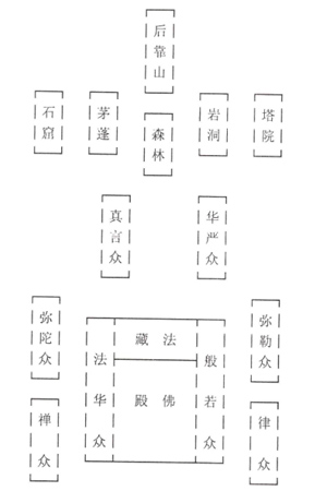太虚还为人间净土设计了一个具体的模式,认为“此人间净土之具体建设,今两藏、暹罗庶近之。然在中华建设,普陀山之圣道场地,最为合宦。”在这里,“假有周围数十里之一山,由国家舍为佛教无税地,泉水充足,竹水茂盛,出垄耕种稻麻,可敷数万人至二万人衣食。在山高深平稳之处,建一大寺,内有释迦牟尼佛殿为总道场;左附讲堂、僧堂,住般若众;右附讲堂、僧堂,住法华众:后附法藏;后左有毗卢遮那佛华严海会殿,附讲堂、僧堂,住华严众;后右有毗卢遮那金胎,两界曼陀罗殿,附密坛、僧堂,住真言众;左后有弥勒内院殿,附讲堂、僧堂,住唯识众:右后有弥陀极乐殿,附讲堂、僧堂,住净业众;左前有戒坛、板堂,住律众:右前有法堂、禅堂,住禅众。共住苾刍、菩萨约五百至一千,其式如图。”