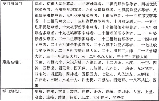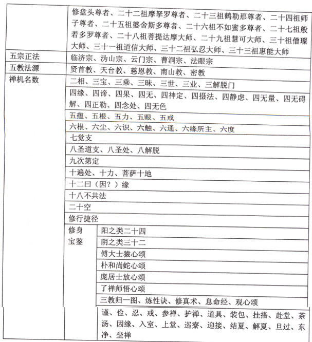 l、内容通俗浅显、文字简洁。如[佛法源流·初祖]“大迦叶尊者,奉世尊法衣于鸡足山入灭尽定,以俟弥勒下生尊者阿难传正眼法藏,继绍祖位。”[五宗正法·沩山宗]“沩山,仰山也,乃百丈之口,至五代开运二年,不嗣。沩山、仰山、南塔、清化。”[禅机名数·二相]“心相、身相。”这些佛教知识类似今日之名词解释,十分简单,没有任何的展开论述。