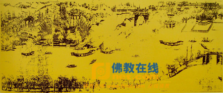 所刊古画原是一幅山水画长卷,但登载书上的只是其中一局部图[见图二]。非常幸运的是,所登载的局部图画面内容,由东往西刚好是南宋时的断桥、兜率寺、大石佛院、十三间楼楞严寺、水月园等景物,画面景象非常繁盛,八百多年前的北宋弥勒大石佛全貌,清清楚楚地展现在大石佛院内,很是令人惊讶与震撼!虽然由于原图经拍摄成照片,又印刷成书,许多细节部分已经模糊不清了,但仔细察看,还是能看清大石佛院中大佛头的基本装束与形象。