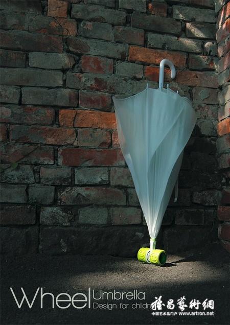 小朋友在拿雨伞的时候,会因为雨伞过长或是过重等因素而时常将雨伞拖在地上走,因为持续将它提起对小朋友来说是件很辛苦的事情,那设计师就设想如果在伞的底部加上个轮子呢?在伞的最底部加上两个轮子,轮子表面再凸出个笑脸,滚过雨水时便会不自觉的在地上留下一排笑脸,就好像滚轮章一样,让孩子们拿伞更轻松,也更有趣。