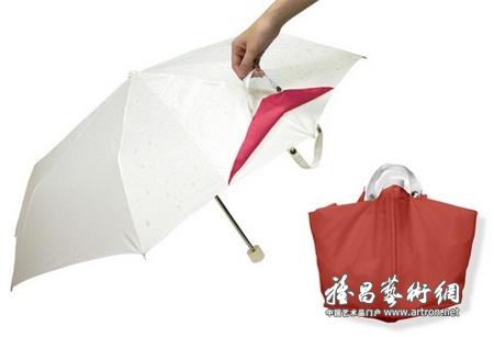 设计师 Seung Hee Son 设计了一个独特的折叠伞,在伞面上隐藏了一个双层设计,雨伞折叠之后,把这个双层部分翻过来就变成一个布袋,把雨伞整个装起来,防渗漏的材质足以保证你的雨伞在进入大厦到进入卫生间之前“滴水不漏”,而且这个设计相比目前普通的折叠伞并没有增加太多的生产成本,在生产工艺上也很容易实现,如果投产一定是个不错的产品。