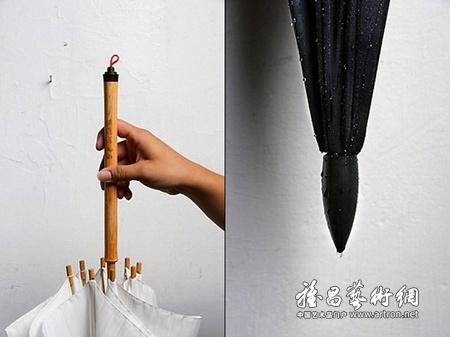台湾科技大学的刘香伶从这样的情景得到启发,设计出这款雨伞,伞柄如一根笔杆,束起像是一只毛笔,更有趣的是,伞面采用特殊材质,遇水会变黑色,无水则是白色,刚用过的雨伞收起垂挂,就会出现上图这样上白下黑的样子,更是像极了饱蘸香墨的毛笔。