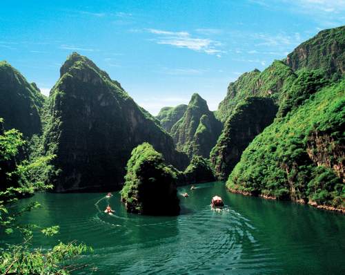 游人可沿河流顺谷而下至龙庆峡。这段峡谷长约10公里,谷底狭窄,两侧山峰陡峭,遍布峰林、峰丛、孤峰、石锥,缓坡和台地上,次生林茂密,景色十分秀丽迷人。