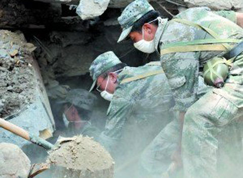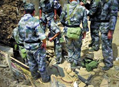 10日,救援人员用探测仪搜寻生命迹象。李强 摄