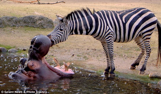 瑞士一动物园上演称奇一幕:斑马为河马“洗牙”