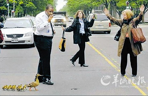 这是不久前美国《华盛顿邮报》头版上的主图。一只鸭妈妈正带着一群小鸭子穿越城市里的大马路。近处是两位爱心洋溢的中年妇女,他们不惜违反交通规则,走到马路中央,做出下意识的保护鸭子的姿态。